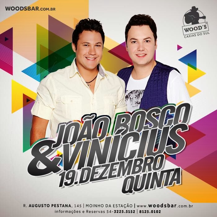 Dia 19 de Dezembro a dupla João Bosco e Vinicius se apresentam na Wood's Caxias (Rua Augusto Pestana 145 Moinhos da Estação), nada menos que uma das duplas sertanejas de maior sucesso da atualidade, eles vão afinam as cordas da viola e os pulmões e fazer a festa em Caxias.